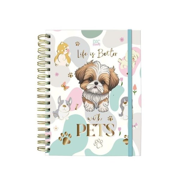 Caderno universitário compacto com 80 folhas e capa dura temática Pets. Perfeito para anotações do dia a dia com praticidade e um toque divertido.