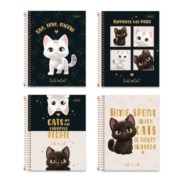 - 1x CADERNO ESPIRAL COLEGIAL CAPA DURA 10X160 FOLHAS CUTE CAT