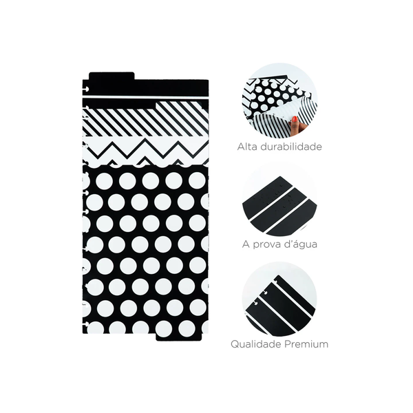 A Divisória para Caderno Inteligente Grande P&B com 04 unidades, da Caderno Inteligente, é um conjunto de quatro divisórias em preto e branco no tamanho grande, compatíveis com o sistema de discos dos Cadernos Inteligentes. Elas permitem separar e organizar diferentes seções ou matérias dentro do caderno de forma funcional, com um visual clássico e contraste marcante.