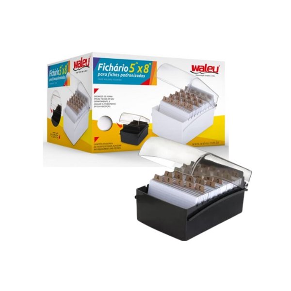 Organize suas fichas de forma prática e moderna com o fichário acrílico 5x8 Waleu. Fabricado em material resistente e com acabamento fumê, é ideal para escritórios, clínicas, recepções e uso pessoal.