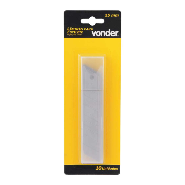 Jogo com 10 lâminas largas Vonder de 25mm, fabricadas em aço de alta resistência. Lâmina segmentada em 6 partes para melhor aproveitamento. Ideal para uso em estiletes em cortes gerais.