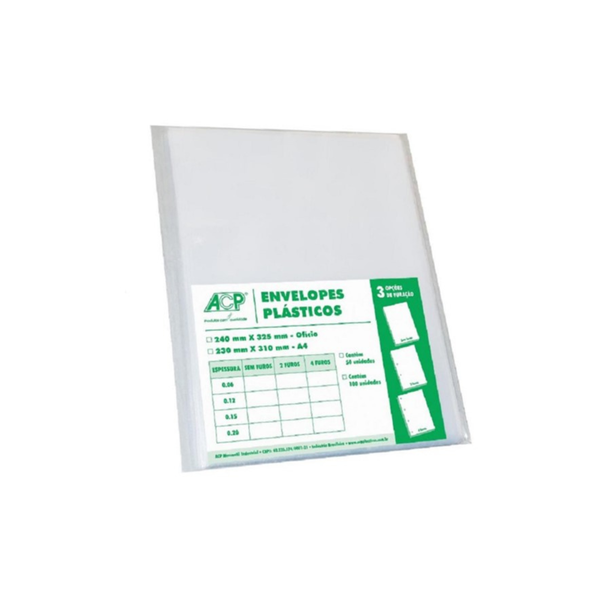O Saco Plástico 23x31 cm A4 com 4 furos da ACP é ideal para proteger e organizar documentos em pastas. Com espessura média, é resistente, transparente e vem em embalagem com 100 unidades, garantindo praticidade e economia no uso diário.