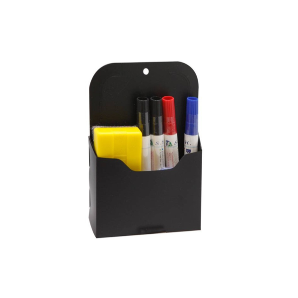 Suporte Magnético para Quadro Branco – conjunto completo que inclui 4 marcadores coloridos, 1 apagador e 6 ímãs organizados em estojo prático. O estojo possui imã na parte de trás, permitindo fixação direta no quadro branco. Ideal para manter seus acessórios sempre à mão, com organização e praticidade no ambiente escolar ou corporativo.