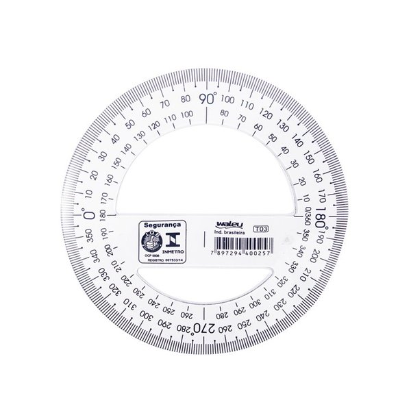 Meça ângulos completos com precisão usando o Transferidor 360° Waleu. Design transparente facilita a visualização, ideal para uso escolar, técnico e profissional.